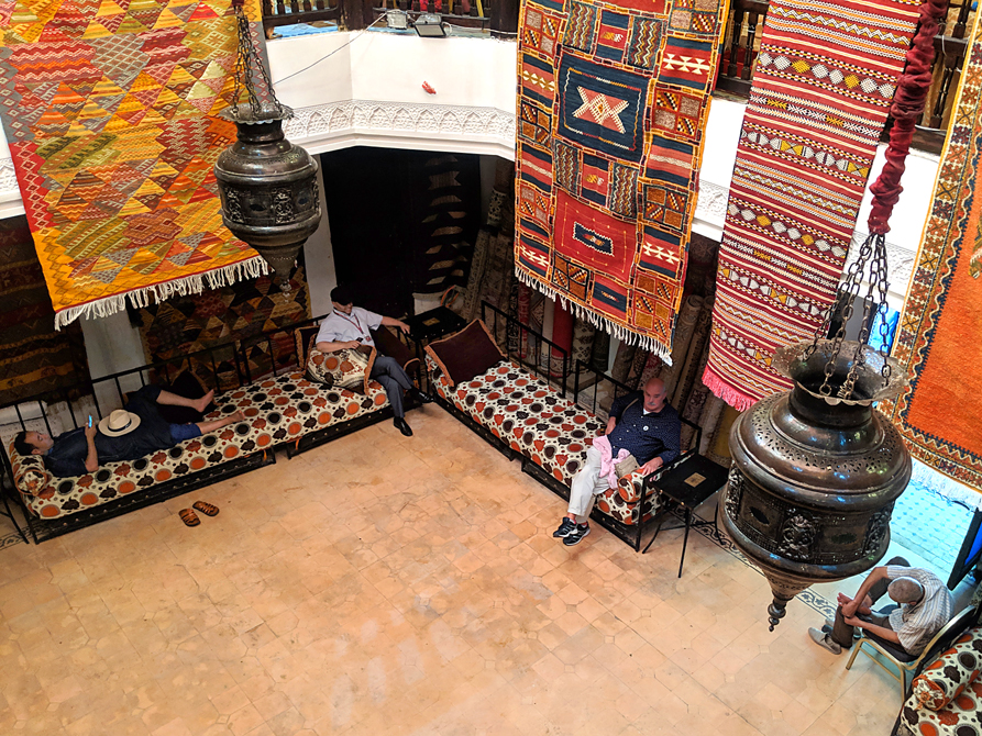 We continued our way through the labyrinth to a Moroccan restaurant for lunch where we were served a salad, chicken in a delicious broth, cous cous with vegetables, watermelon, wine, and water. It was all very tasty. Musicians completed the cultural experience. I did feel a little bad eating and drinking when many of our guides and drivers were still observing Ramadan, meaning no eating or drinking from sunup to sundown. Whenever this situation came up, they would find a place to wait apart from us. Still, it must have made their fasting more difficult.
